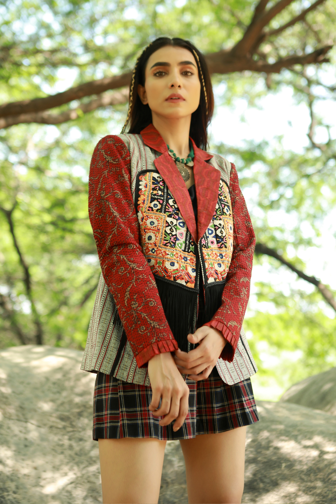 Red and Black kantha and silk jacket with tennis skirt in checks and black cotton bralette inside