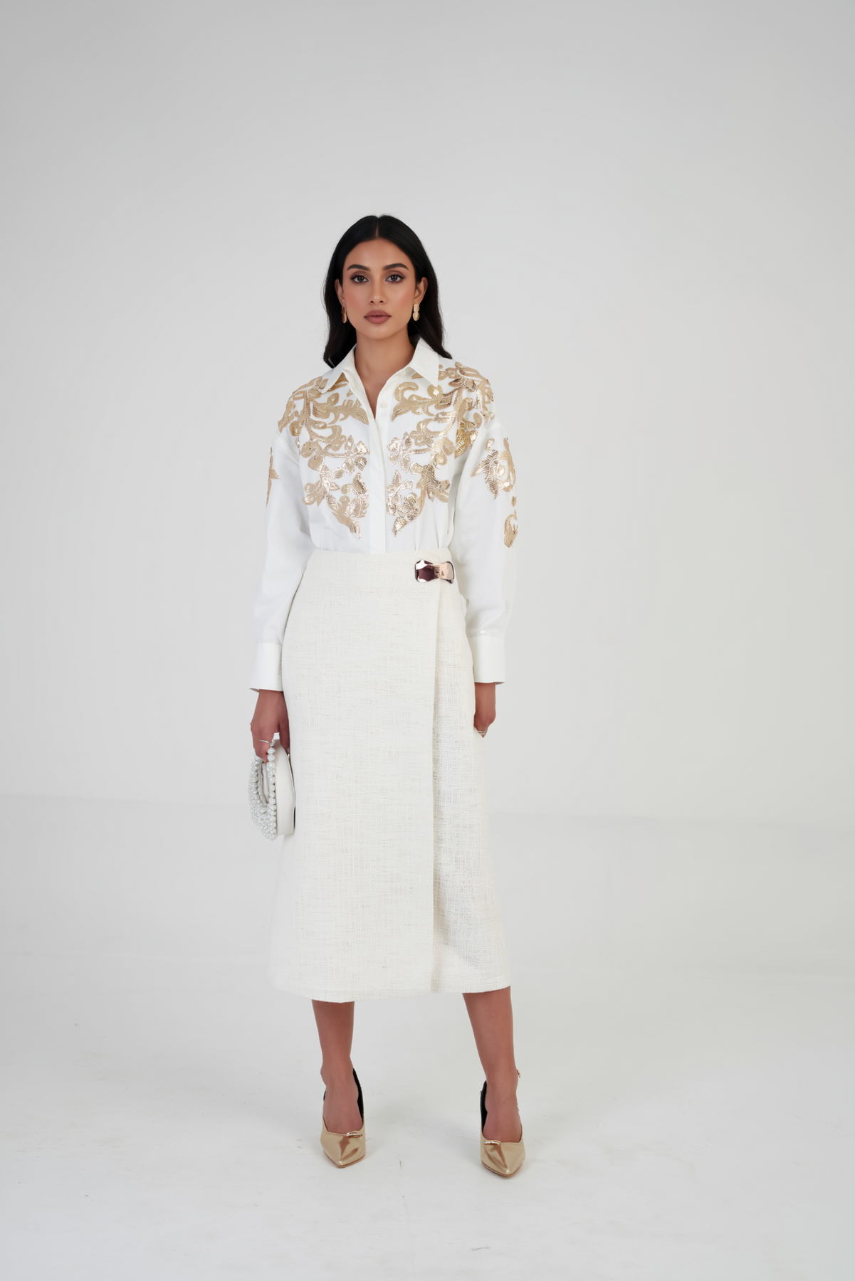 Crafted in premium handloom slub fabric, this skirt features a classic wrap silhouette elevated with a distinctive leather buckle detail, offering the perfect blend of artisan texture and contemporary polish. The crisp white hue adds to its refined aesthetic, making it a versatile wardrobe essential for both day and evening wear.