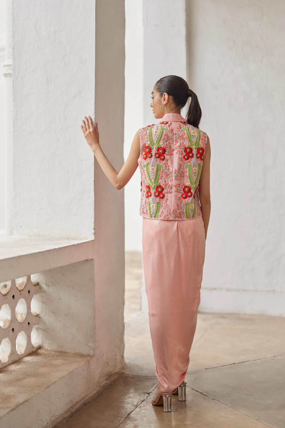 Peach Garden Sequins Drape Skirt Full sequins draped skirt is in georgette fabric. The skirt has half the lining of cotton voile fabric.