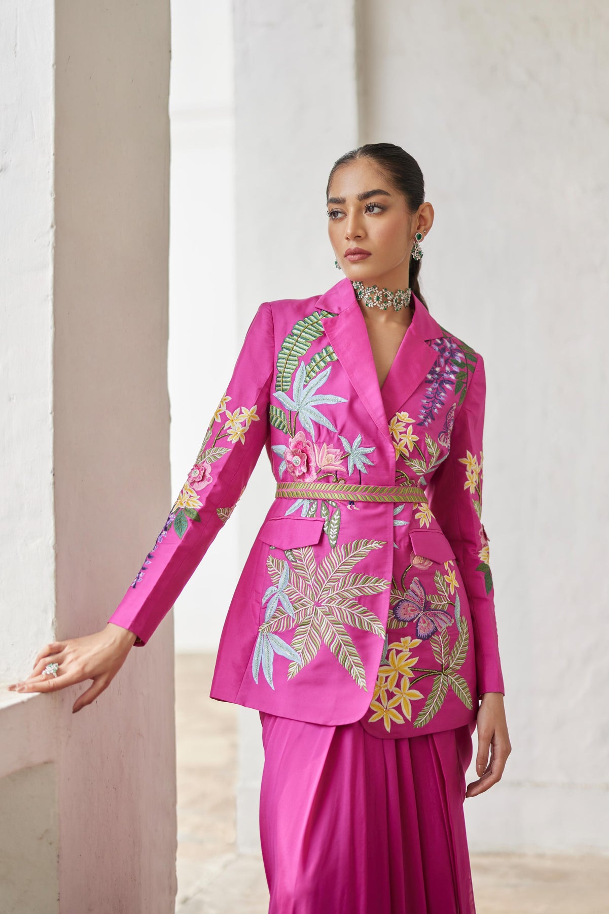 This beautiful embroidered jacket Habutai silk fabric is in a classic blazer style . Match it with the Rani silk draped skirt for all your weddings and special occasions. The beautiful floral embroidery is evergreen mindfully created inspired by the beauty of the tropical forests. The jacket comes with a thin belt and ties over the jacket to give a perfect formal yet stylish look. Your statement jacket is weather friendly and can be worn all round the year. The drape skirt completes the outfit. Match them together for a perfect look. Or wear them as separates as you are unique and BeTrue jackets are statements pieces which can be worn in multiple ways.