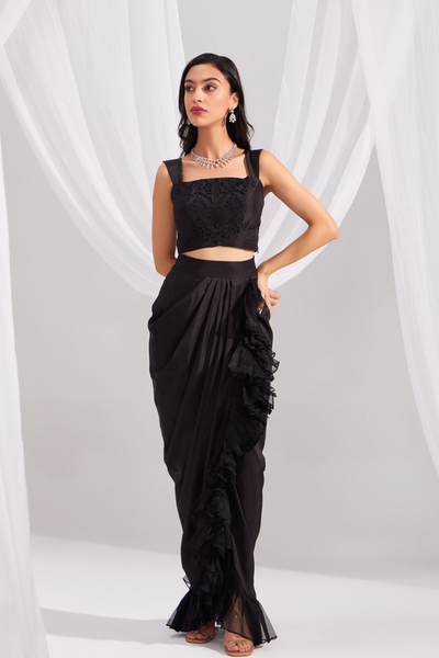 Black Embroidered Silk Bustier & Ruffle Draped Skirt Set