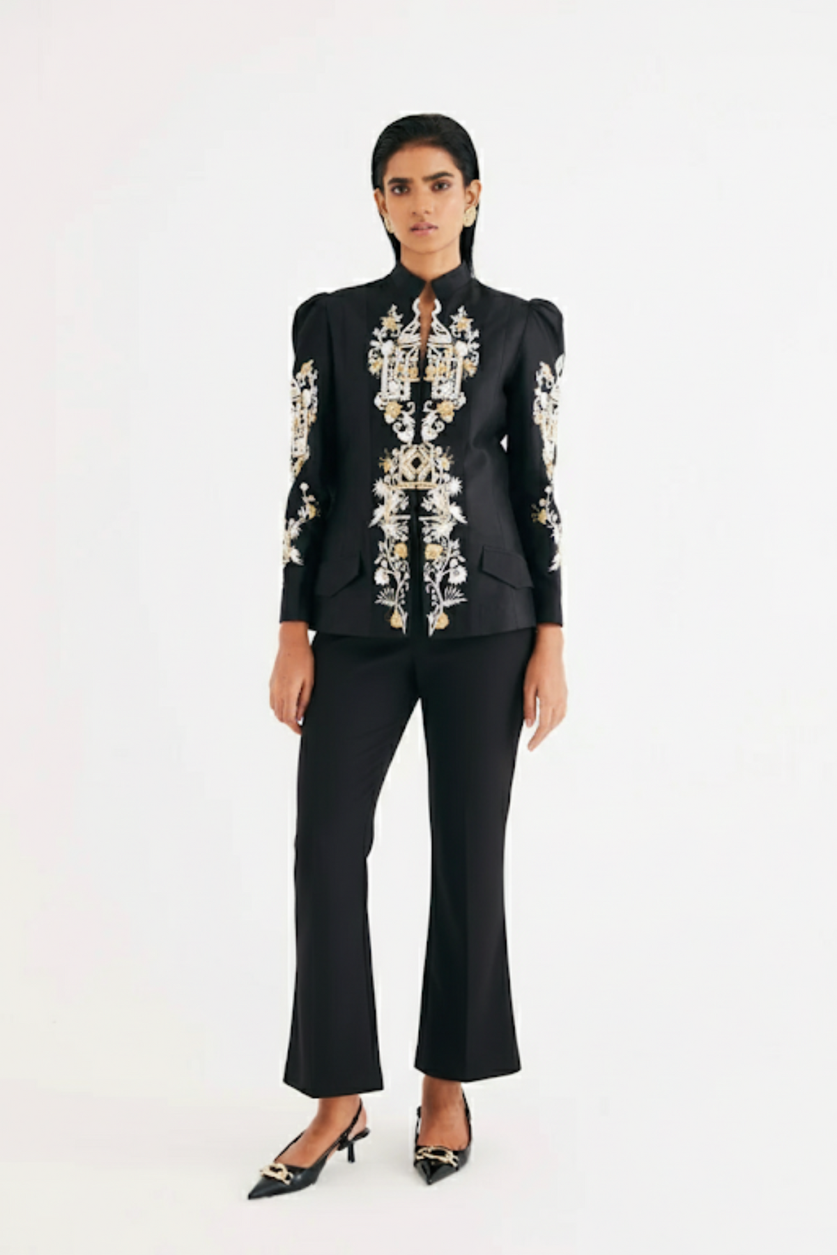 The Black Temple Jacket is an exclusive jacket with all the machine and hand embroidery. The details of embroidery is inspired from India. And it is an absolute piece to add in your wardrobe.