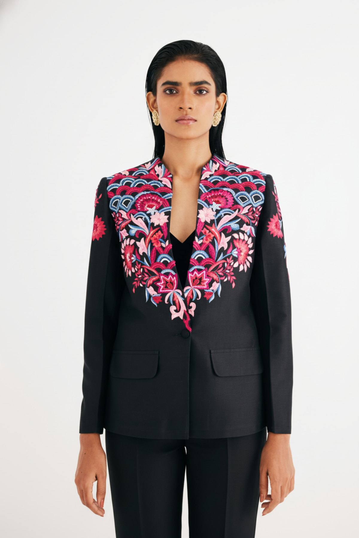 Dare to make a statement in this black jacket made in Luxurious blend of Chanderi cotton and 100% silk fabric. It is enhanced with hand and machine-embellished multi-hued Indian floral self-developed pattern with sequin and beads. Layer it over a dress or matching set, this versatile jacket is fresh off the runway!