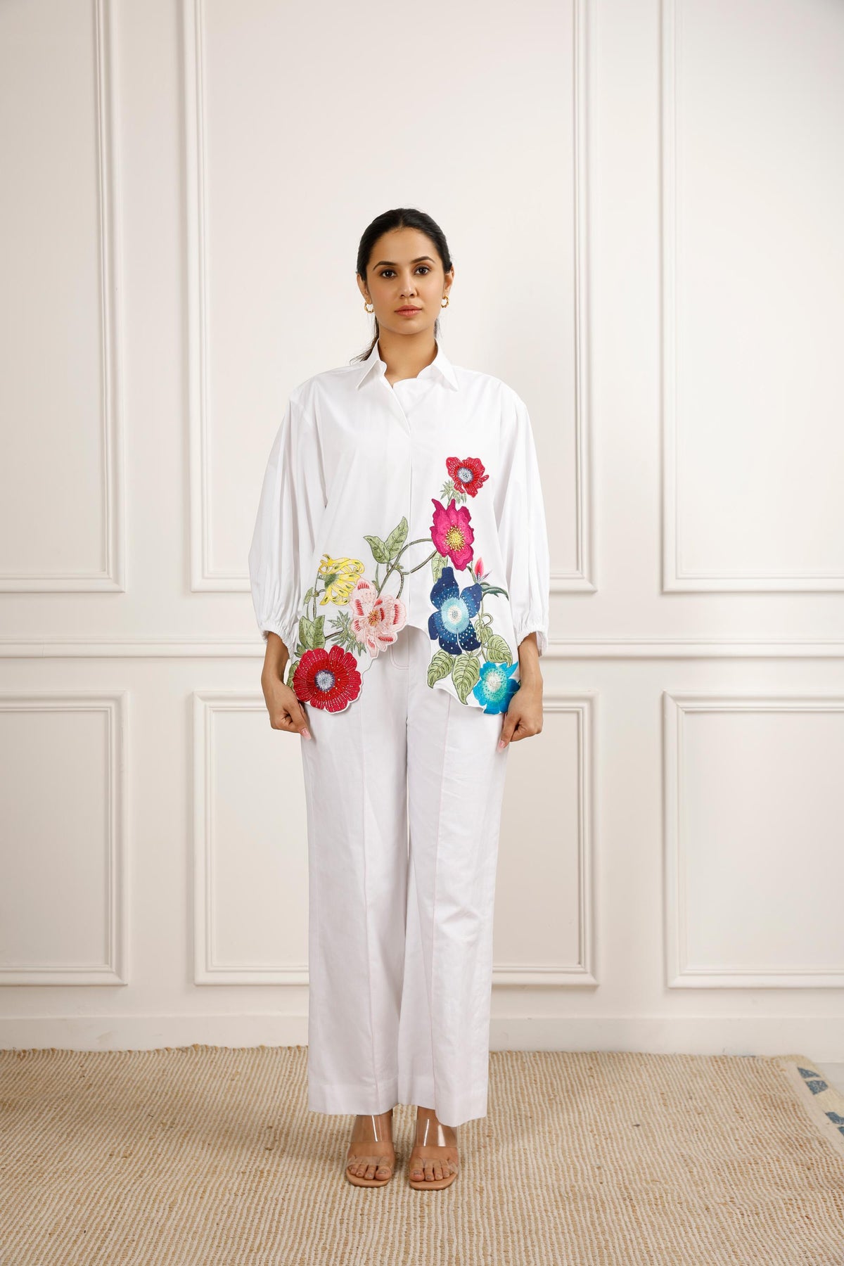 Featuring a white oversized shirt in cotton base with exquisite floral embroidery with resham and sequins, which can be styled in many ways.