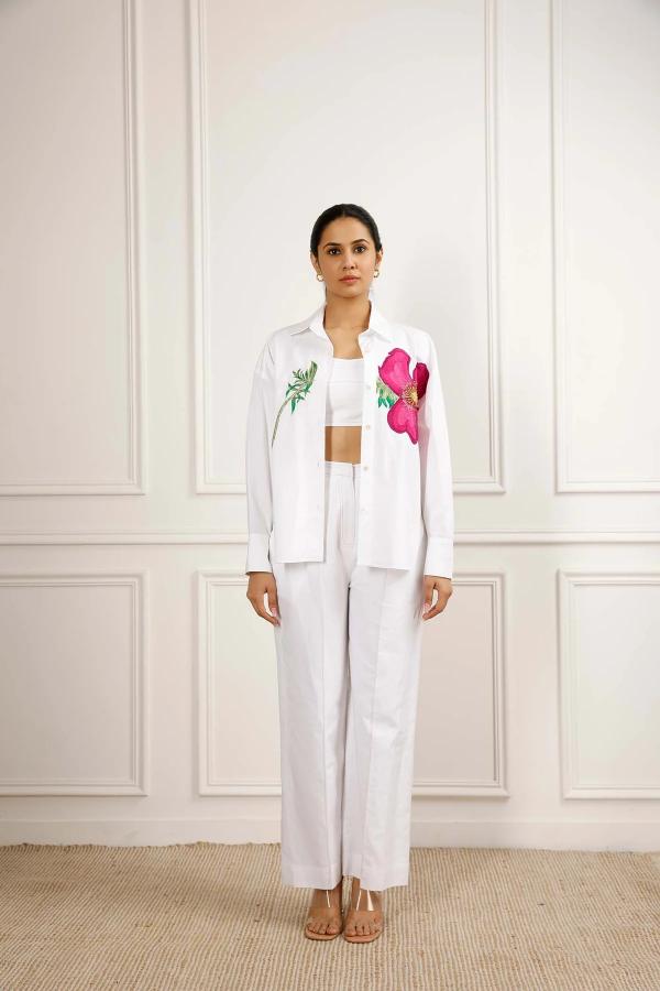 Featuring a white shirt in cotton base with hand embroidery details in front and gathered sleeves. It will surely be a perfect summer shirt in your wardrobe.