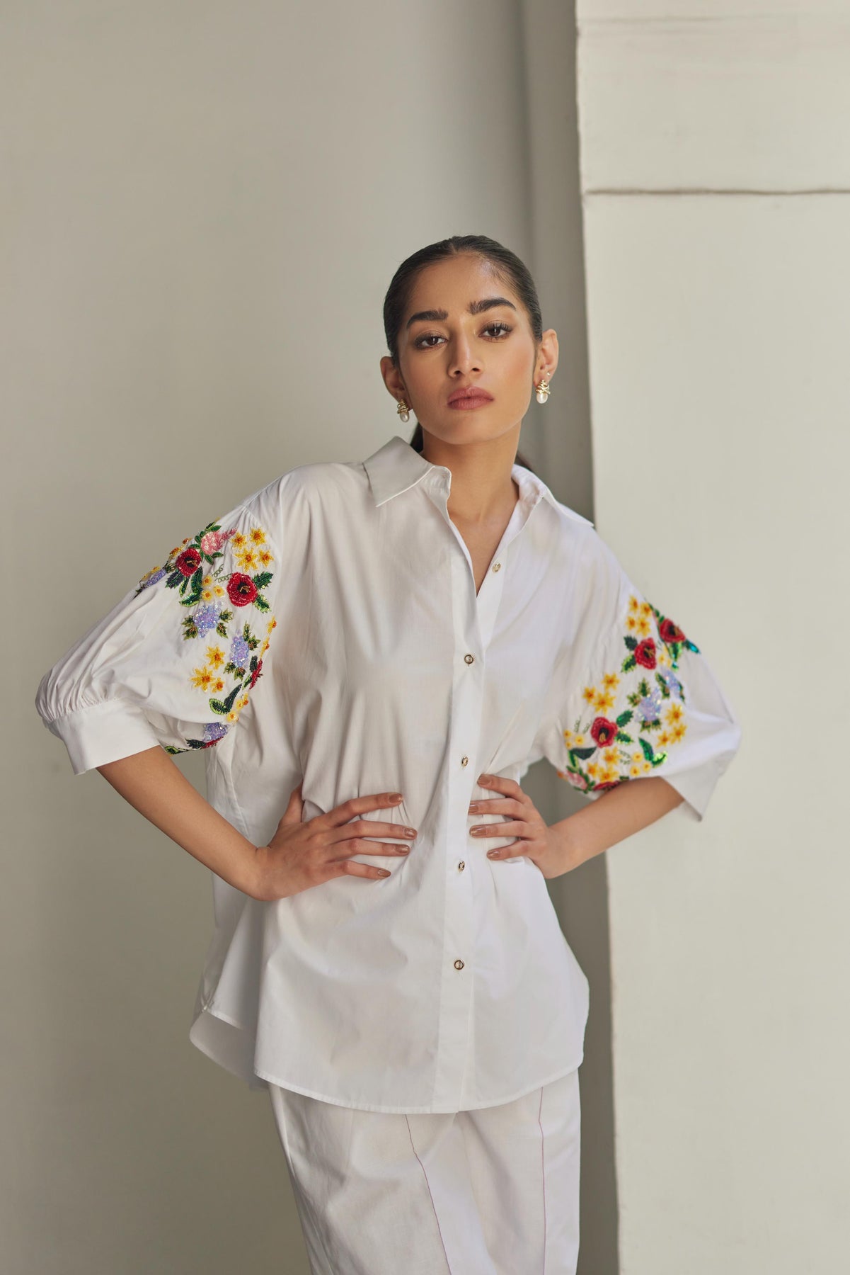 A crisp white shirt beautiful hand embroidery made with detailed multicoloured sequins flowers. Who can so no, to that in summer season. A beautiful addition to a classic. This relaxed style shirt is perfect for all shapes sizes and ages. Wear it over plain white pants or denims or your summer short, this shirt can be worn in multiples ways.