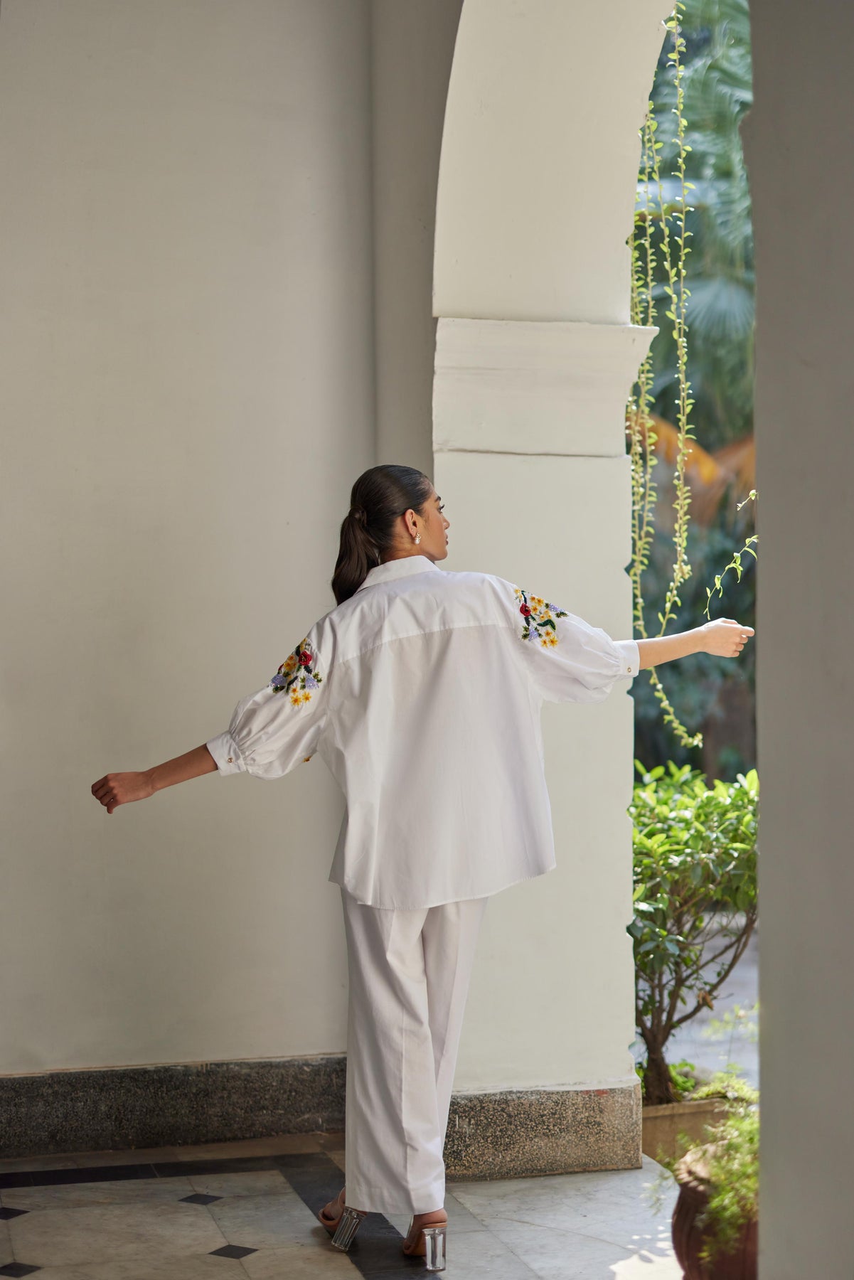 White colour Cotton poplin fabric No lining Hand embroidery on sleeves Front buttons Three fourth sleeves with gathers Relaxed to oversized fit White colour White cotton linen Straight wide leg Mid waist Pink tuck in front Top stitch in pink colour