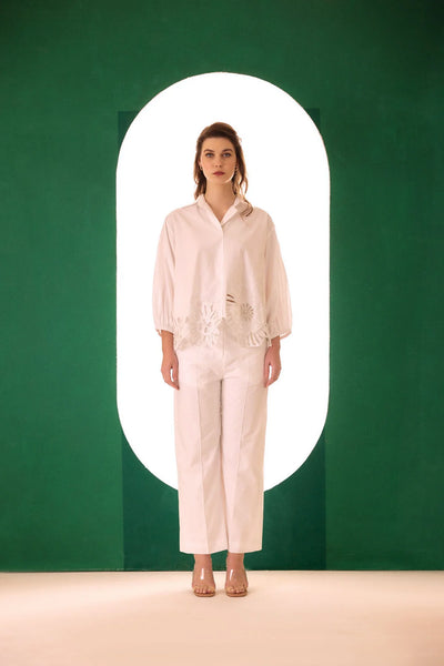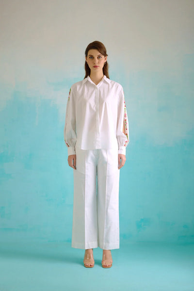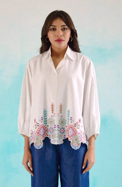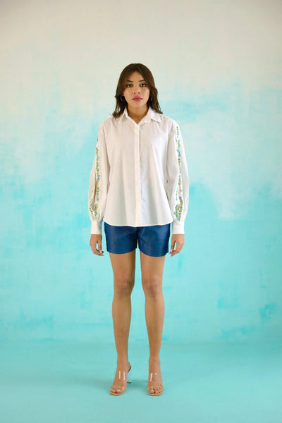 White Hand Embroidered Blue Sequins Upbeat Shirt