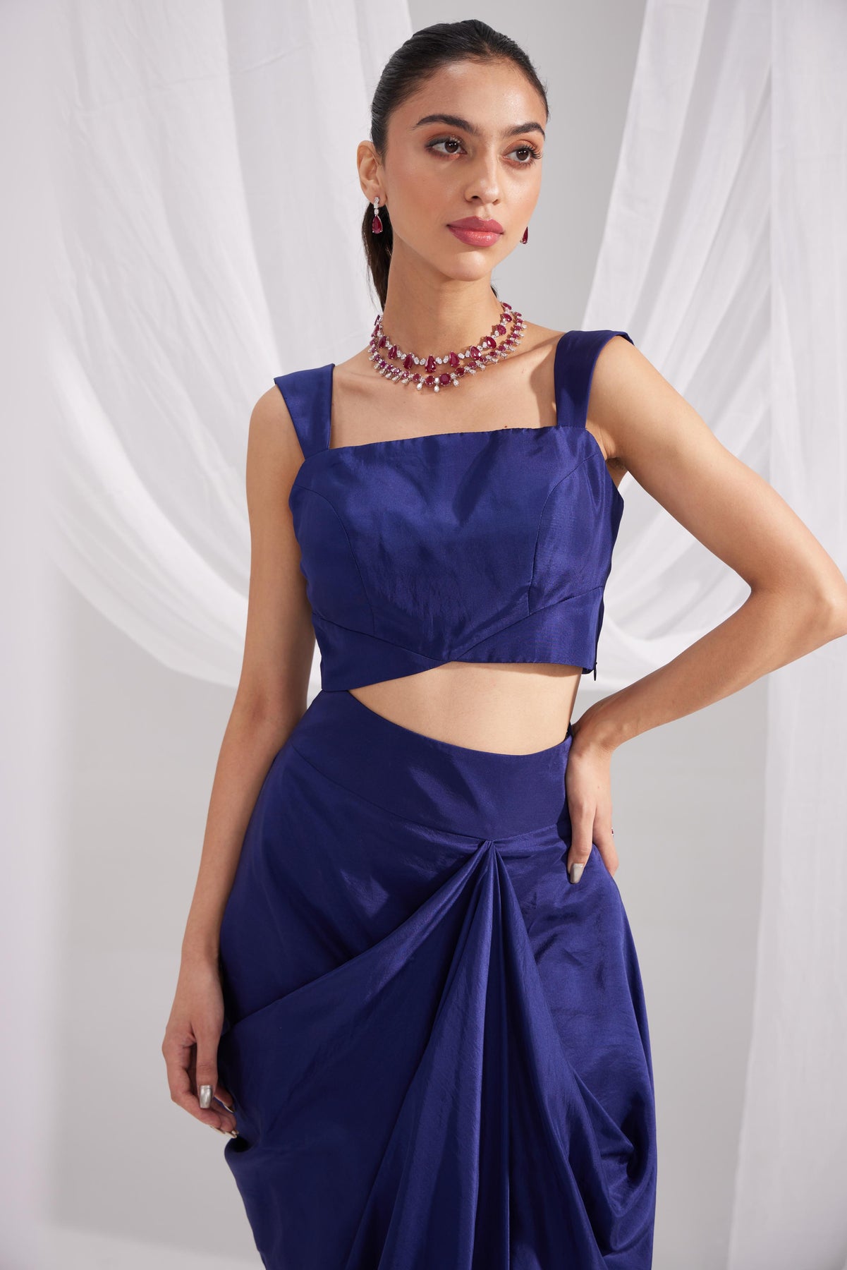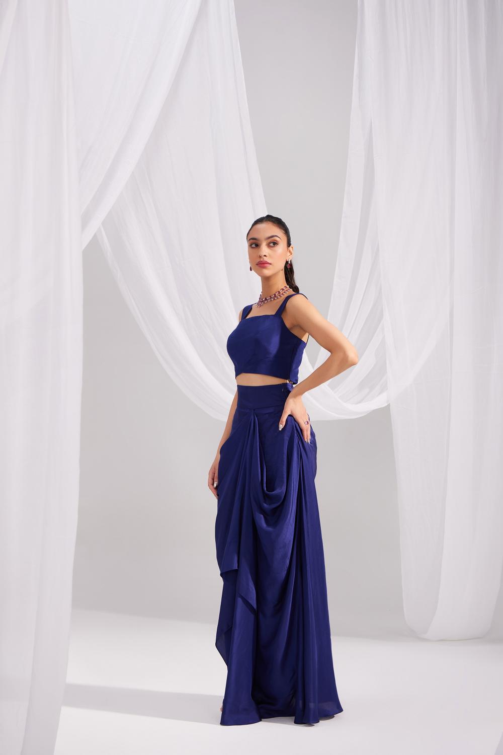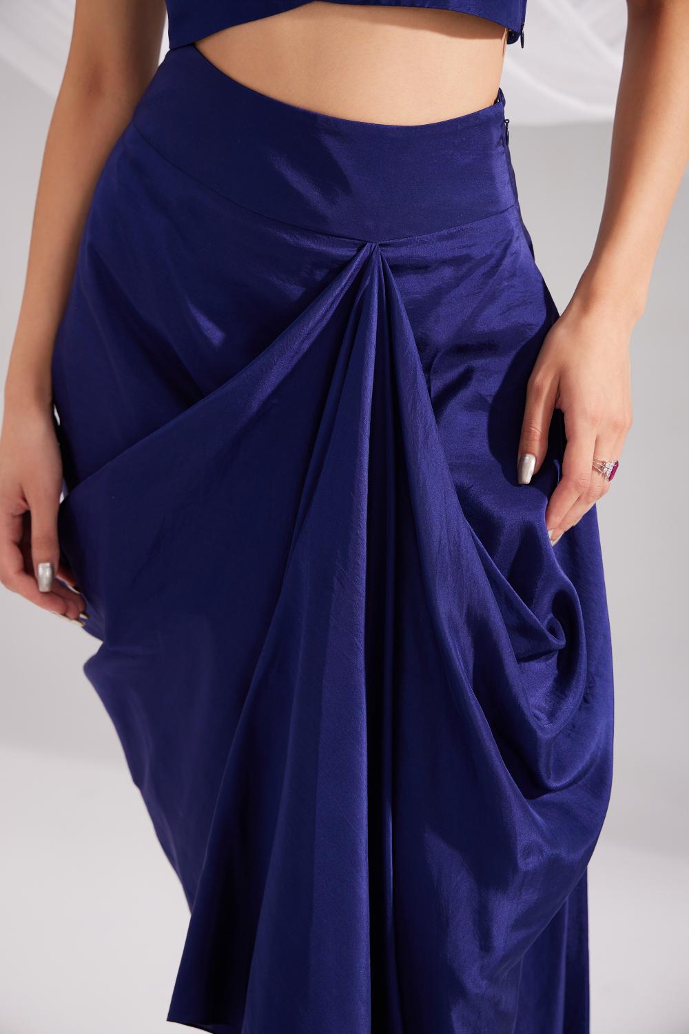 The Midnight Blue Silk Bustier is crafted from premium pure silk, offering a sleek and flattering fitted silhouette. This bustier features built-in pads for added structure and support, while the side zip and hook closure ensure a perfect fit. Paired with the Midnight Blue Silk Draped Skirt, this set is designed to make a lasting impression. The skirt boasts a beautifully draped design, creating fluidity and movement with every step. Together, the structured bustier and flowing skirt create a striking balance of sophistication and grace.