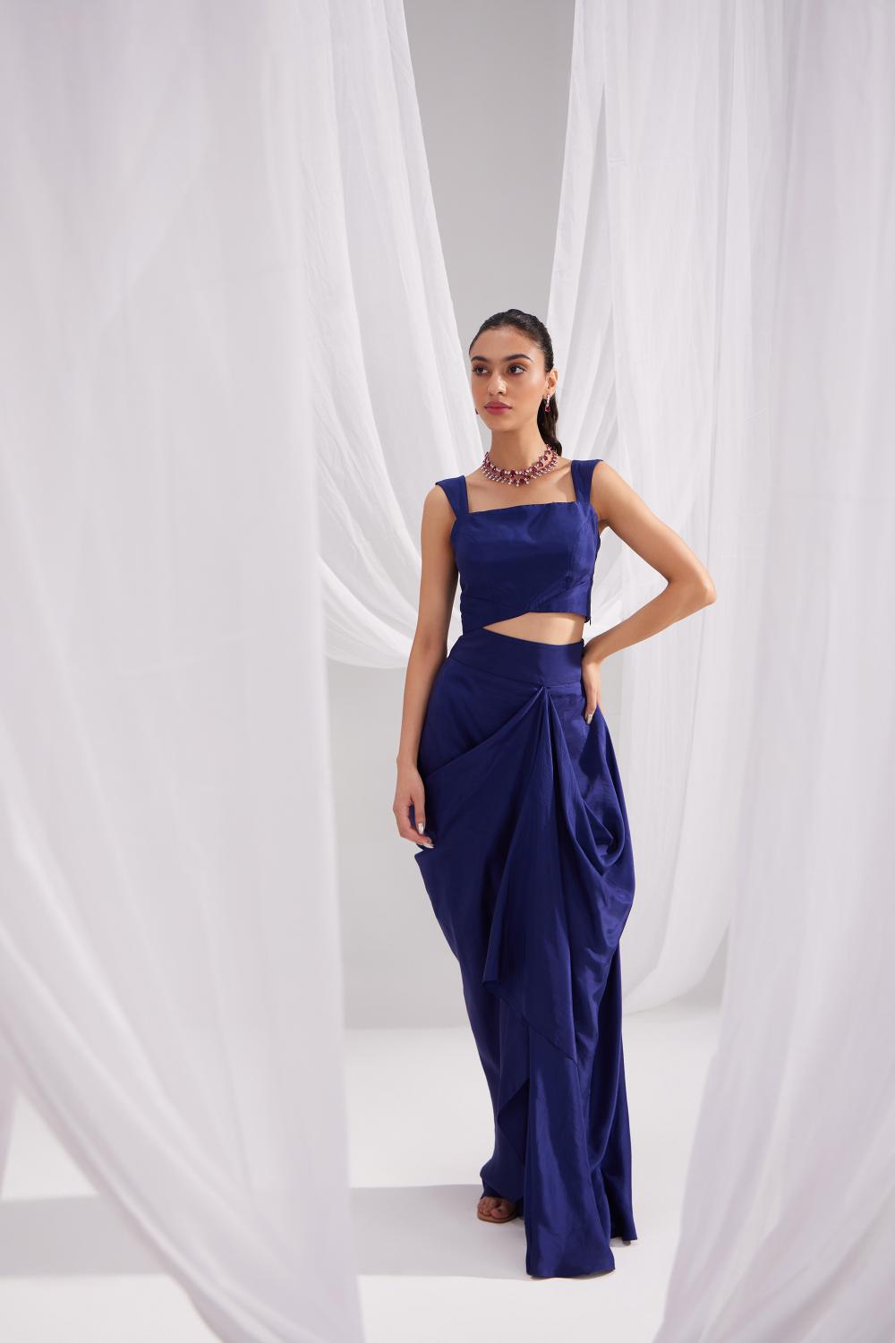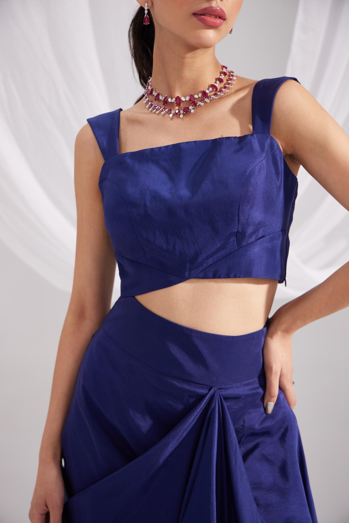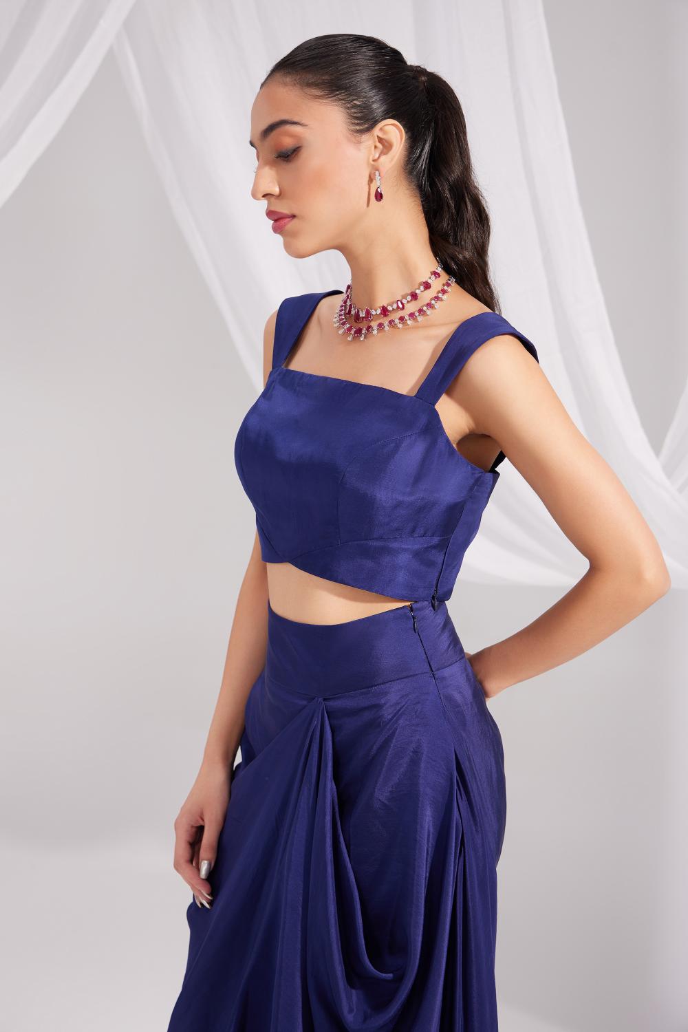 The Midnight Blue Silk Bustier is crafted from premium pure silk, offering a sleek and flattering fitted silhouette. This bustier features built-in pads for added structure and support, while the side zip and hook closure ensure a perfect fit. Paired with the Midnight Blue Silk Draped Skirt, this set is designed to make a lasting impression. The skirt boasts a beautifully draped design, creating fluidity and movement with every step. Together, the structured bustier and flowing skirt create a striking balance of sophistication and grace.