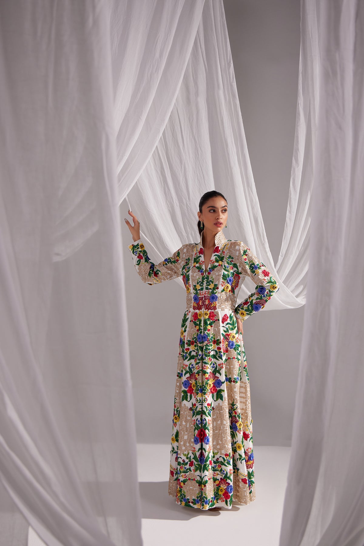 Elevate your wardrobe with the White Imperial Long Embroidered Silk Jacket, a timeless piece that exudes sophistication and grace. Made from pure silk, this long flared A-line jacket is fitted at the chest and waist to create a flattering silhouette for all body types. Its rich embroidery, crafted through a blend of machine and handwork, gives the jacket a regal air that makes it perfect for festive or formal events.