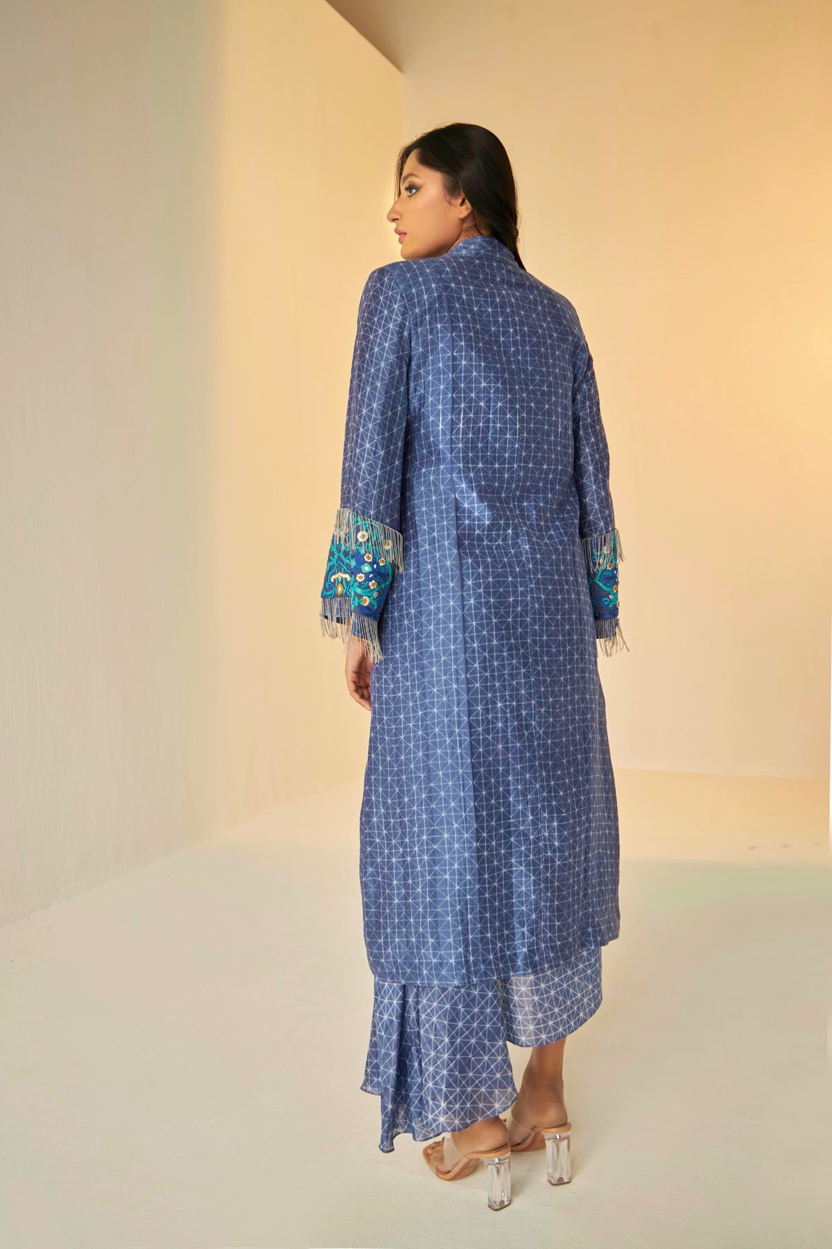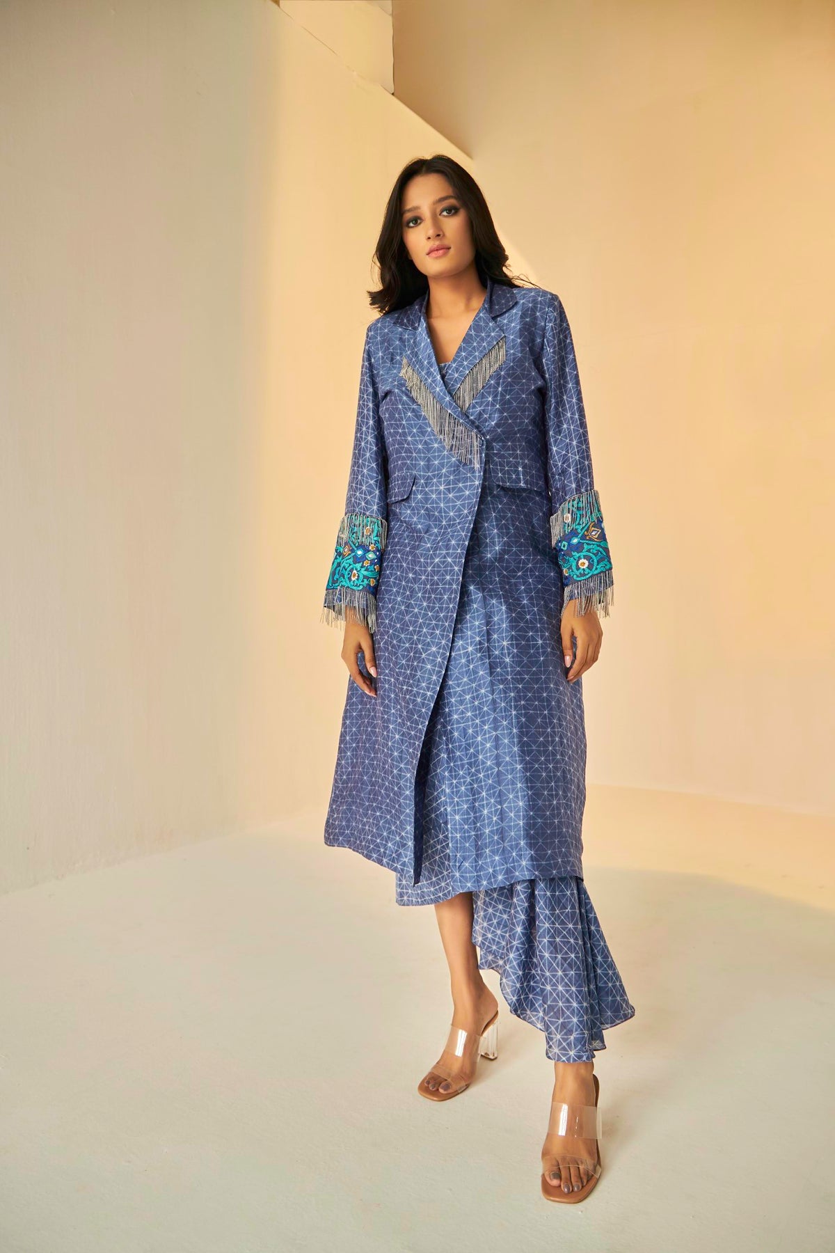 This jacket with its beautiful chain detail in the front and embroidery in the sleeves is a unique and a versatile piece. A statement jacket which you can team up with a kurta and pants or over a dress or even your regular denims. Hand tie and dye Shibori design on the fabric adds to its remarkable aesthetic.