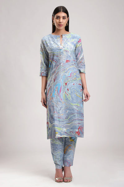 Blue-Wrap Jacket And Pants Set In Tashkent Print