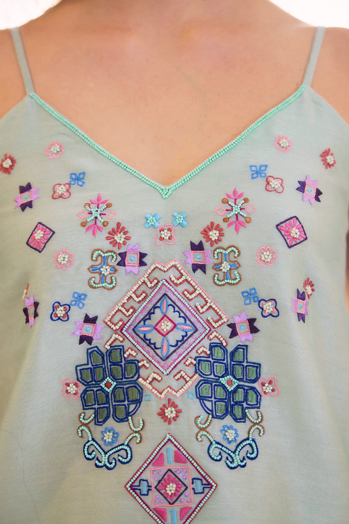 Adorned with delicate embroidery that conjures dreams of distant lands and fantastical tales, each stitch tells a story of magic and imagination. The flowing silhouette drapes gracefully, embracing you in a cocoon of comfort and style. Pair it with mint embroidered dreamer culottes and spaghetti to complete the look