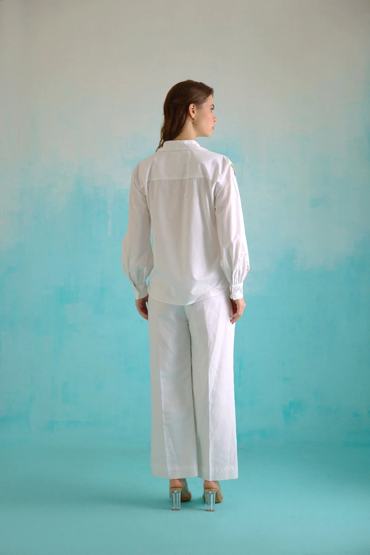 A dazzling fusion of sophistication and vibrancy. Crafted from pristine white fabric, this shirt features intricate hand embroidery adorned with sparkling red sequins, creating a captivating and glamorous look. The upbeat design exudes energy and charm, making it perfect for special occasions or adding a pop of excitement to your everyday wardrobe. Pair it with tailored trousers for a chic ensemble or with denim for a more relaxed yet stylish look.