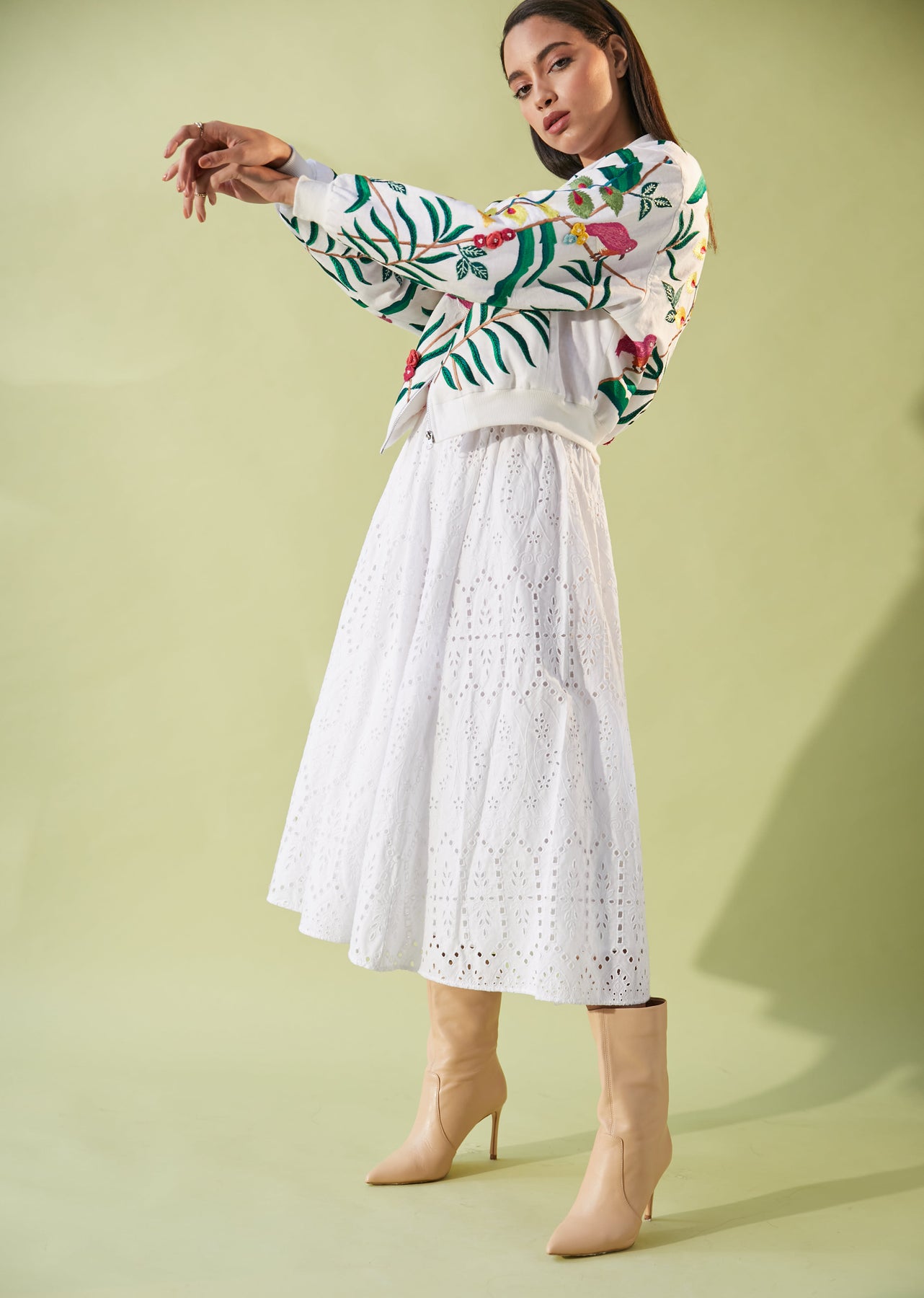 Bali ivory bomber is a classic style bomber jacket. it is inspired by the natures foliage and is fully embroidered on a white linen base. It has a contrasting ghingham check lining, side pockets, and ribs at the hem. This statement jacket will take you from morning to night, And is a sure winner.