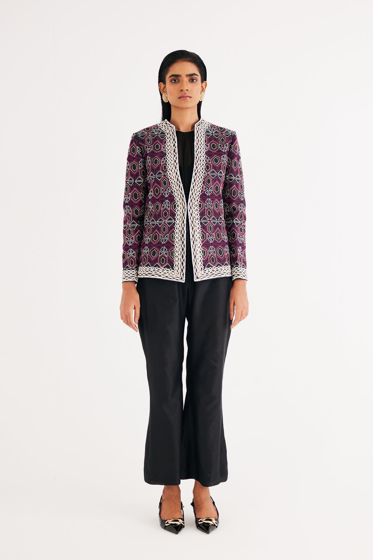 Dare to make a statement in this black jacket made in Luxurious blend of Chanderi cotton and silk fabric. It is enhanced with machine Embroidery, inspired by Mughal Architecture Pattern. Pair it with our Black Chanderi Silk Flared pants for a chic and fashionable ensemble. Wear it for a day event or an Office. This outfit will carry you with ease and style.