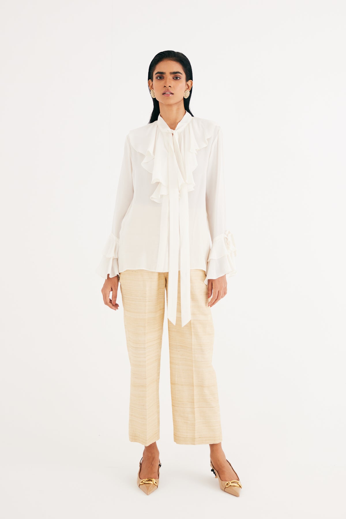 Manderian collar style with extended tie-up and Ruffles attached at neckline