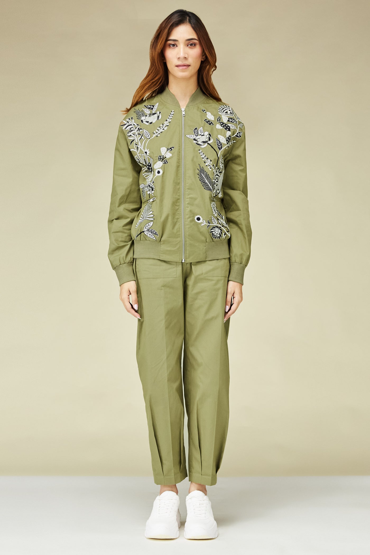 A green khaki statement jacket in cotton twill with beautiful Resham embroidery which will elevate your everyday look. Wear it over your denims or match it with our khaki pleated pants.