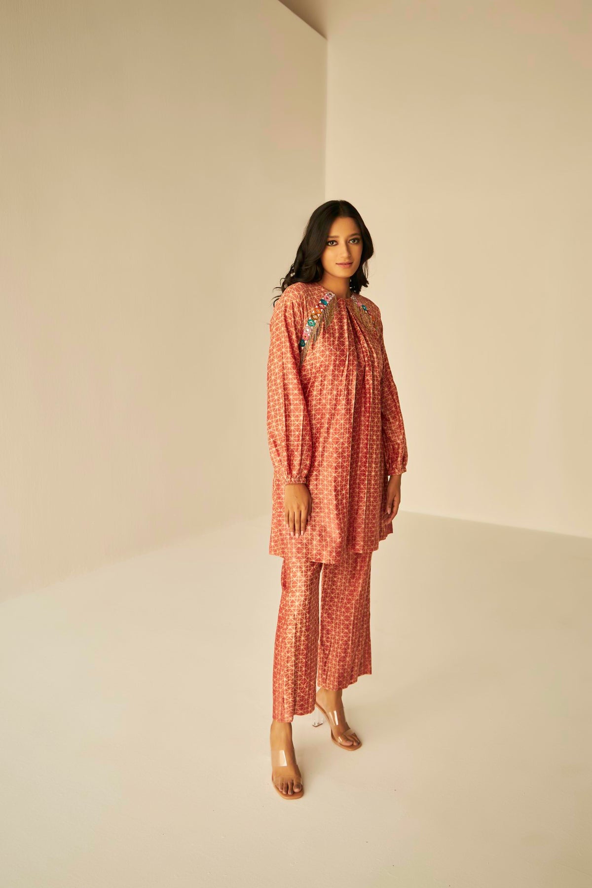 Rust colour Chanderi silk fabric Hand tie and dye shibori Neat machine embroidery with chain hanging Loose fit with pleats in front Back button Straight wide leg pants with back elastic Garment is lined Comes as a set only